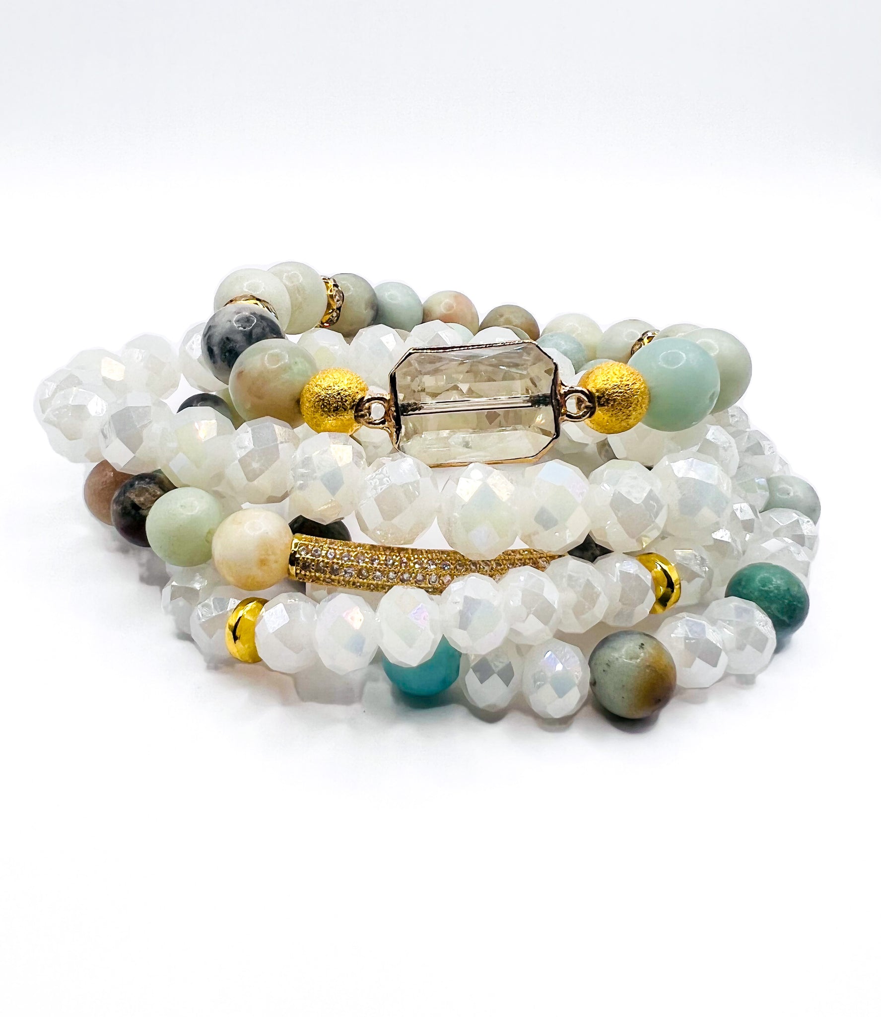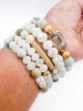 • Light green amazonite stones and glass beads make this bracelet shine. Pair with any outfit. Features crystal center stone and crystal and gold plated tube bracelet.